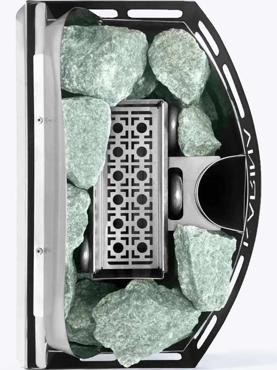При достижении показателя заданной температуры, электрокаменка полностью не отключается, а работает на постоянной основе в 50% от максимальной мощности, чтобы камни в печи всегда были горячие и давали пар. В отличии от любых аналогов (где печь отключается целиком, и камни становятся холодные). При понижении температуры в парной на 2-3 ℃ от заданной, вторые 50% мощности подключаются, и каменка начинает работать в полную мощность.