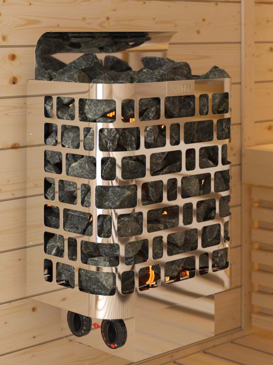Серебристый цвет корпуса и облицовки из стали придают электрокаменке современный и стильный вид.