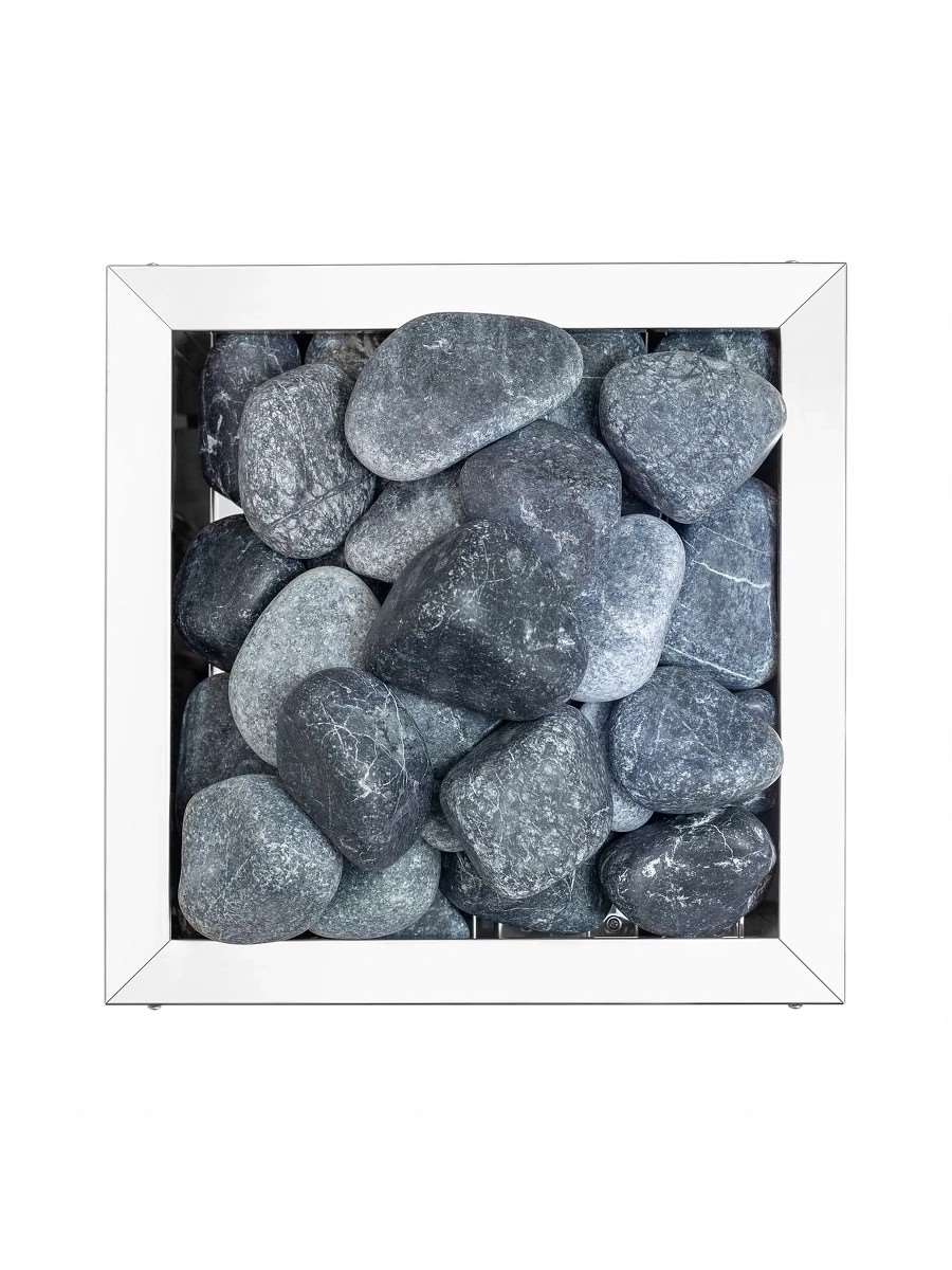 Представленная модель электрокаменки имеет отсек для камней, который вмещает до 25 кг. Она монтируется напольно.