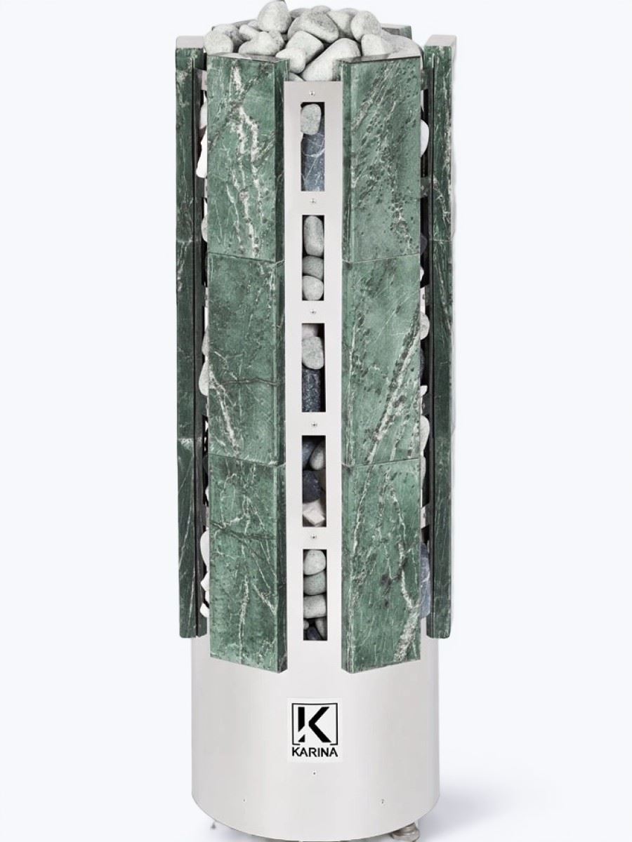 Все корпусные элементы печи выполнены из нержавеющей стали. Нагревательный элемент - ТЭН диаметром 10мм. Наружный кожух каменки дополнительно облицован плитами из Змеевика толщиной 40мм, что придает ей еще большую теплоемкость и меньшее излучение от металлических элементов, которые выжигают воздух в парной. Общий вес камней – 205кг (120кг – загрузка камней в печь и 85кг - вес облицовки), что сопоставимо с закладкой камней в хорошую дровяную печь. Тем самым с помощью парогенератора, закрытой каменки и закладки камня в 205 кг, легко достигается режим настоящей русской бани.