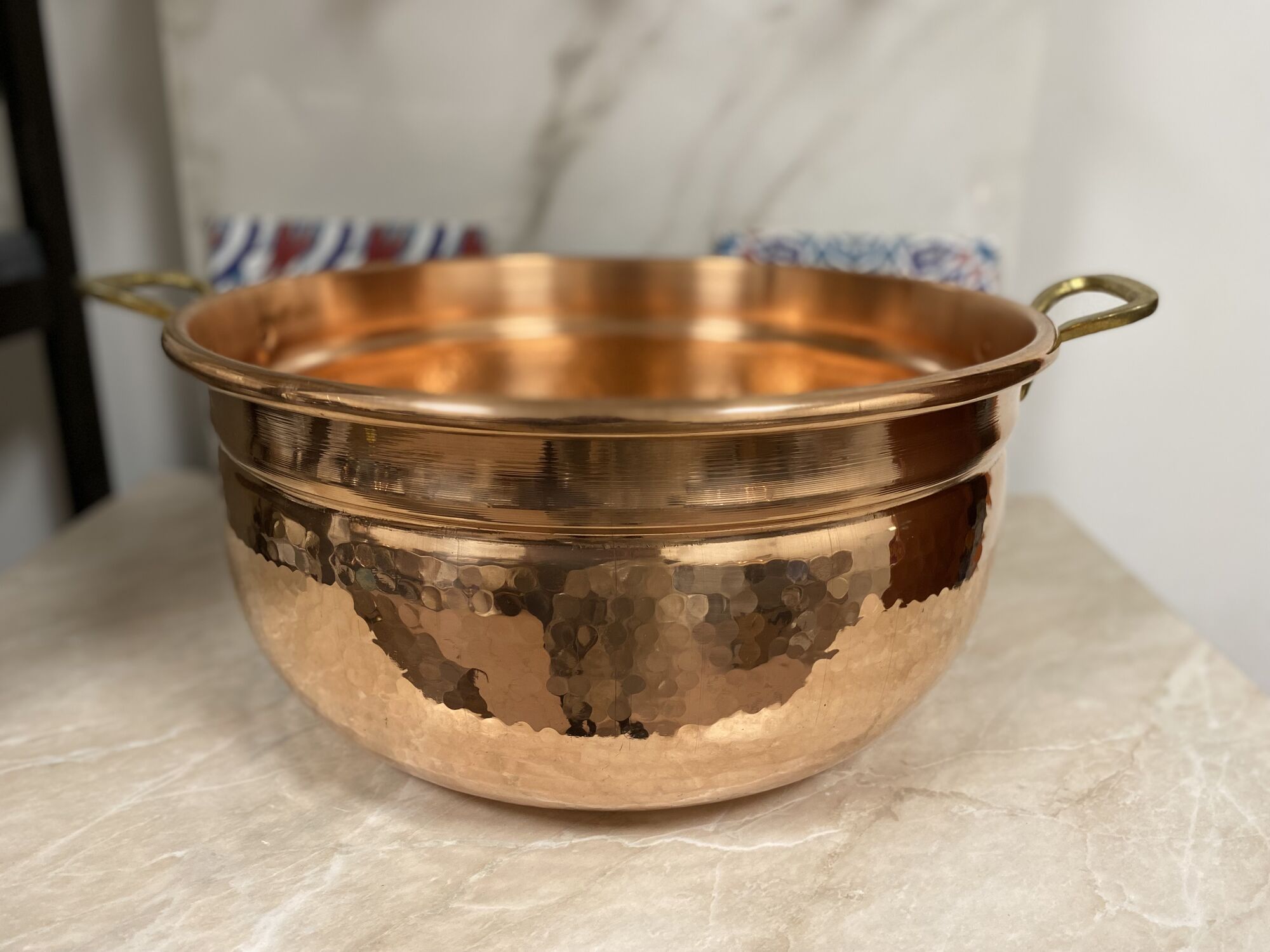 Глубокий медный таз, предназначен для создания специального мыльного раствора, с помощью которого проводится мыльный массаж.